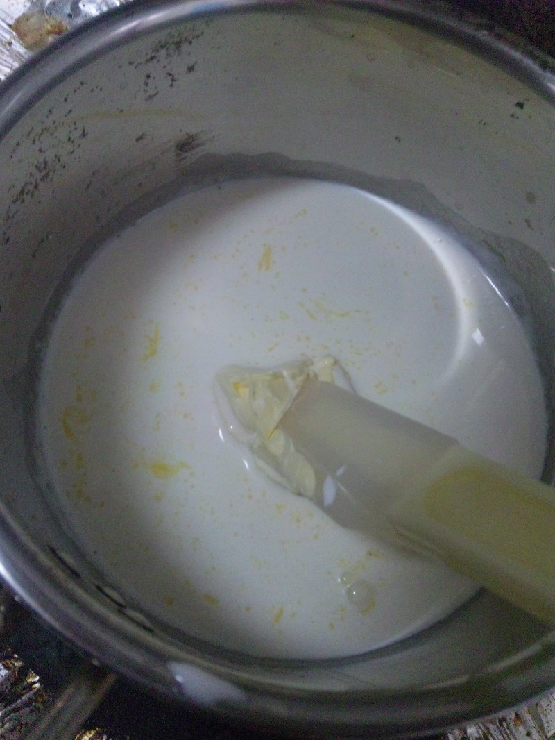 ナベに生クリーム、バターを入れて加熱。