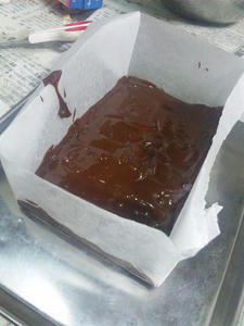 (5)を冷蔵庫から出して、型を開きます。包丁をお湯で暖かくしてから切ります。