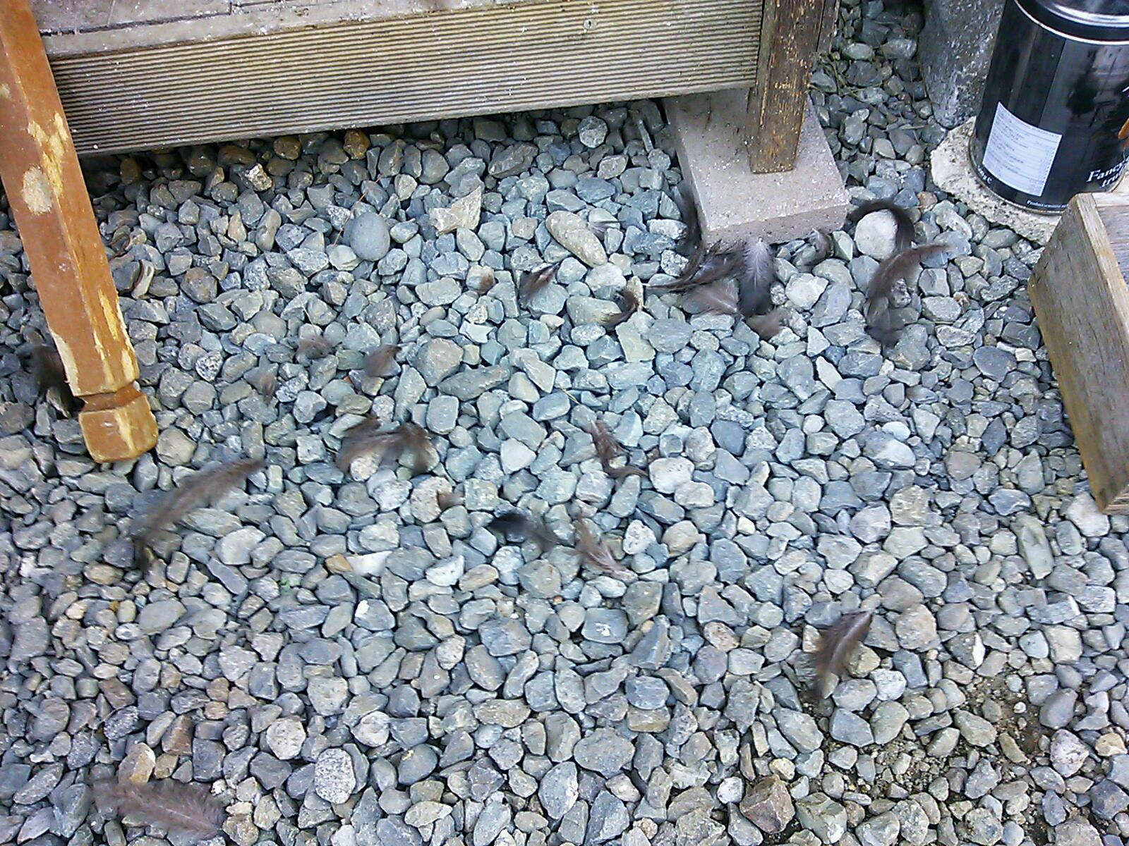 小屋の周りに羽がちらほら落ちている。まさかとおもってヴィスタを見てみると・・・