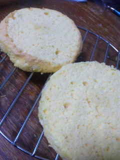 1、スポンジを焼き目のついた表面は取り除き二分割。というかスーパーとかに売ってるスポンジみたいにする。