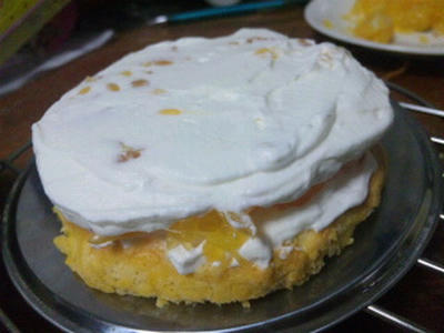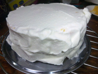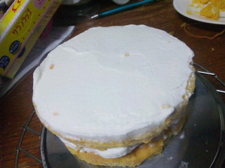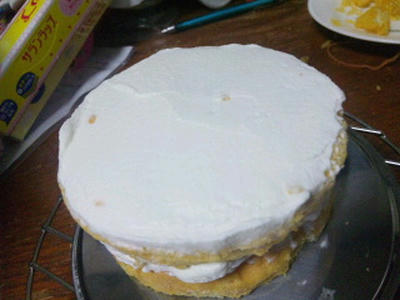 3、残りのスポンジを乗せ、表面に8分立てのクリームを3mmくらい塗る。